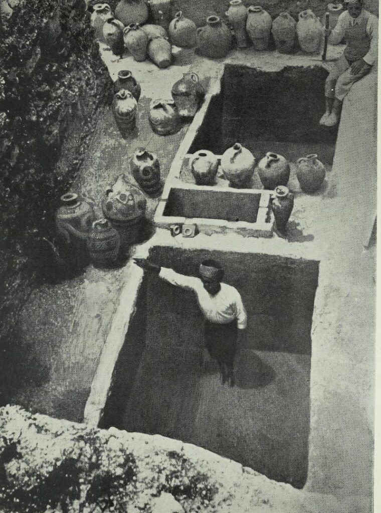 Blick in die heiligen Schatzkammern des Palastes zum Zeitpunkt der Ausgrabungen und mit den großen in den Boden eingearbeiteten Behältern, einer weiteren kleinen, oberflächlichen Cist sowie in den großen Behältern aufgefunden Keramikgefäße – Foto aus Palace of Minos Volume 1 – Seite 465 (10)
